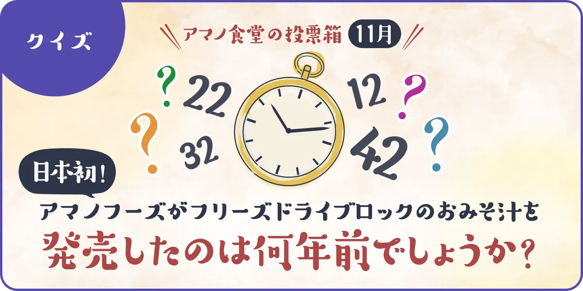 アマノクイズ!「日本初!アマノフーズがフリーズドライブロックのおみそ汁を発売したのは何年前でしょうか?」